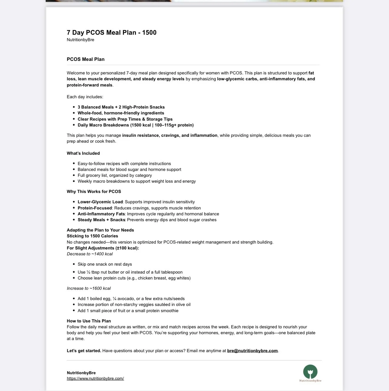 Reach your health and weight goals with this 7-Day 1500-Calorie PCOS Meal Plan—expertly designed to support hormone balance, reduce inflammation, and improve insulin sensitivity. Perfect for women looking for a calorie-controlled approach without sacrificing flavor or nutrition.