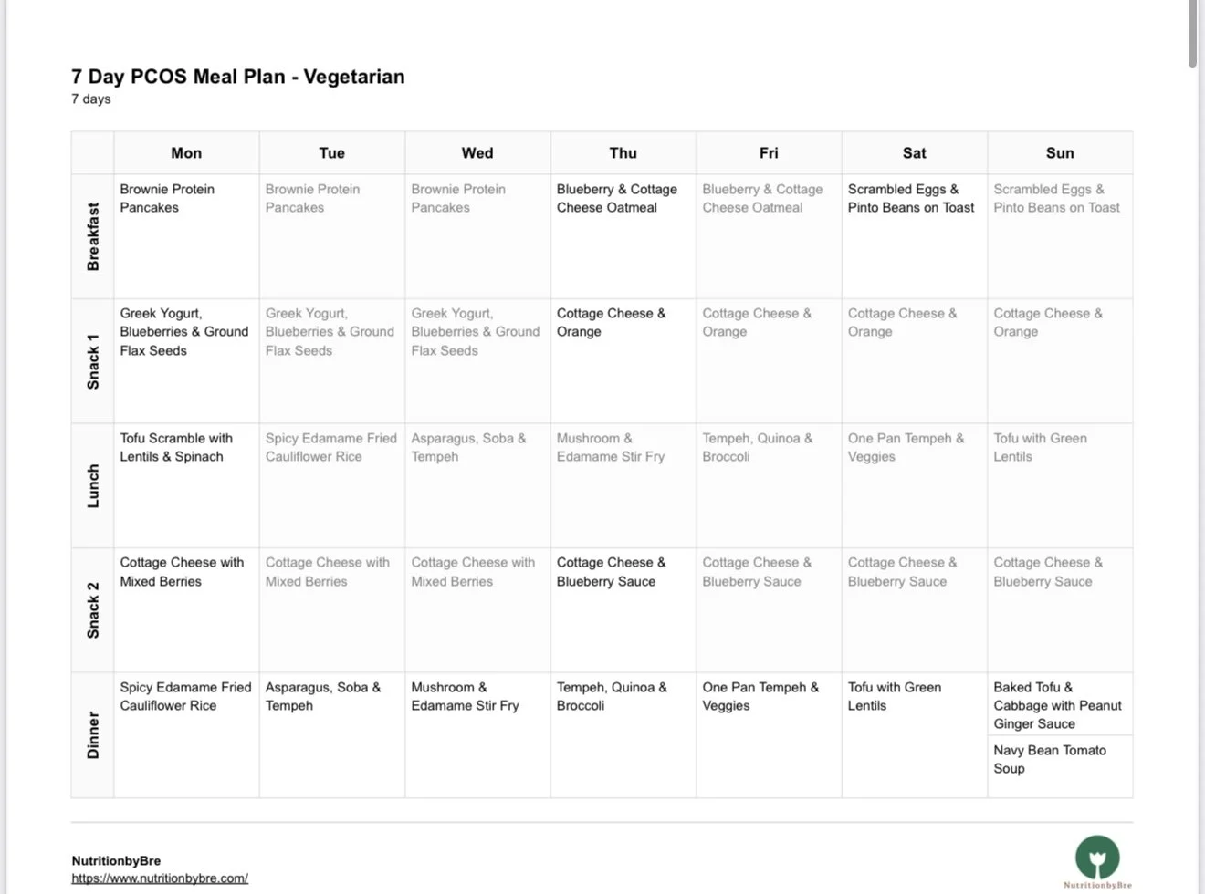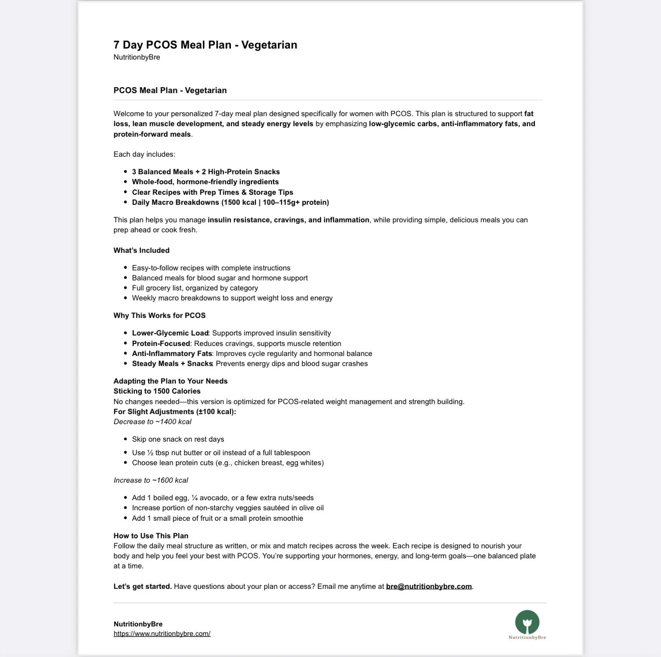 Enjoy the benefits of a 7-Day Vegetarian PCOS Meal Plan that’s rich in protein, fiber, and hormone-friendly nutrients—without any meat. This plan helps reduce inflammation, support healthy blood sugar, and maintain a healthy weight, while keeping your meals satisfying and simple to prepare.