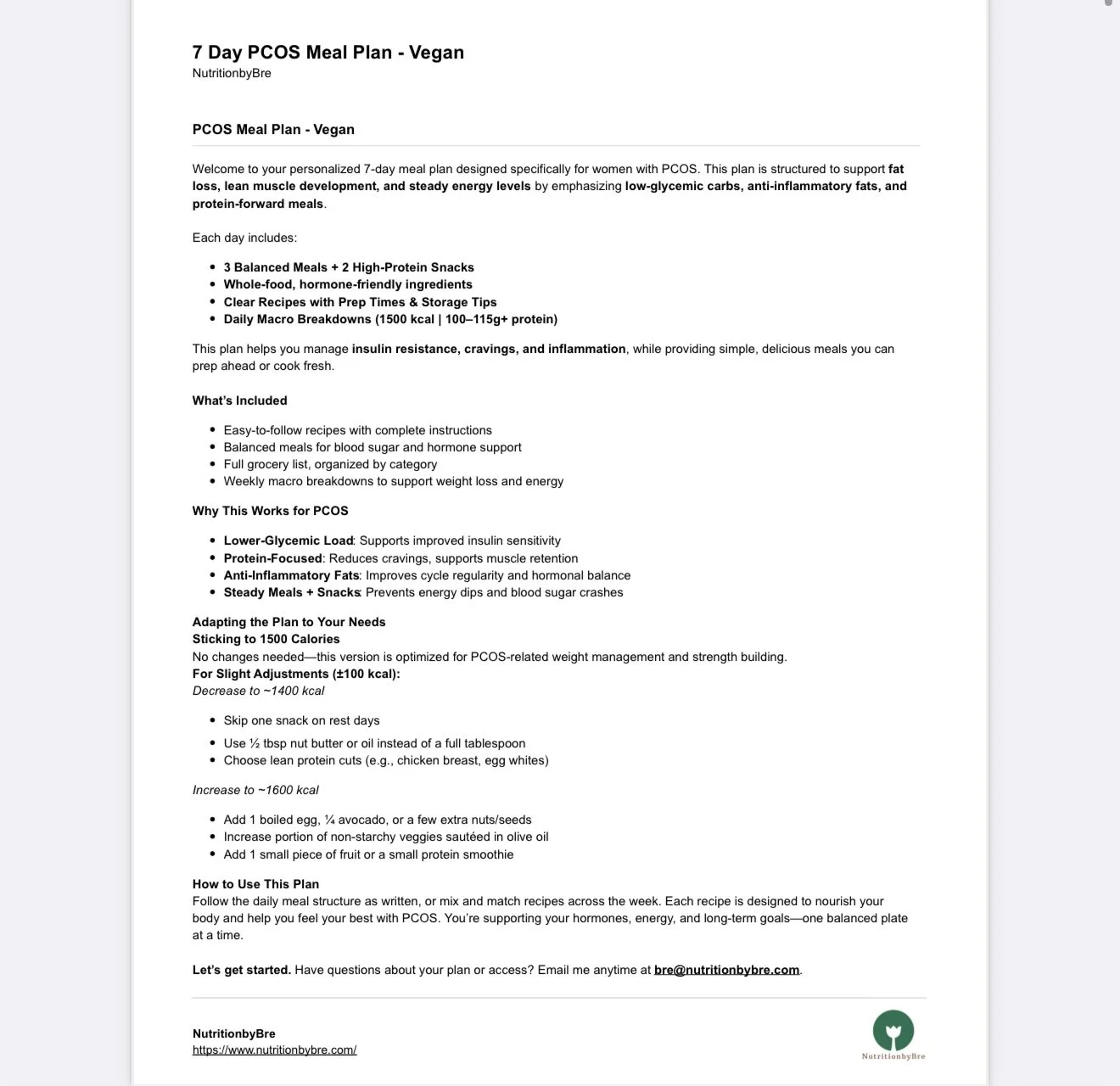 Support your PCOS naturally with this 7-Day Vegan PCOS Meal Plan, designed by a registered dietitian to nourish your body with hormone-balancing, anti-inflammatory, plant-based meals. Perfect for improving insulin sensitivity, sustaining energy, and managing weight—without any animal products.